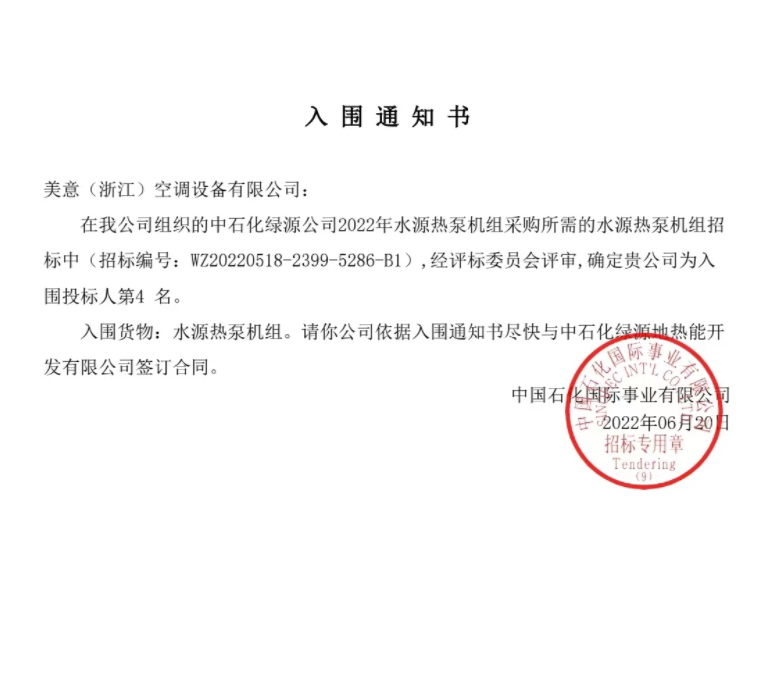 美意再次入圍中石化綠源公司水源熱泵采購(gòu)單位